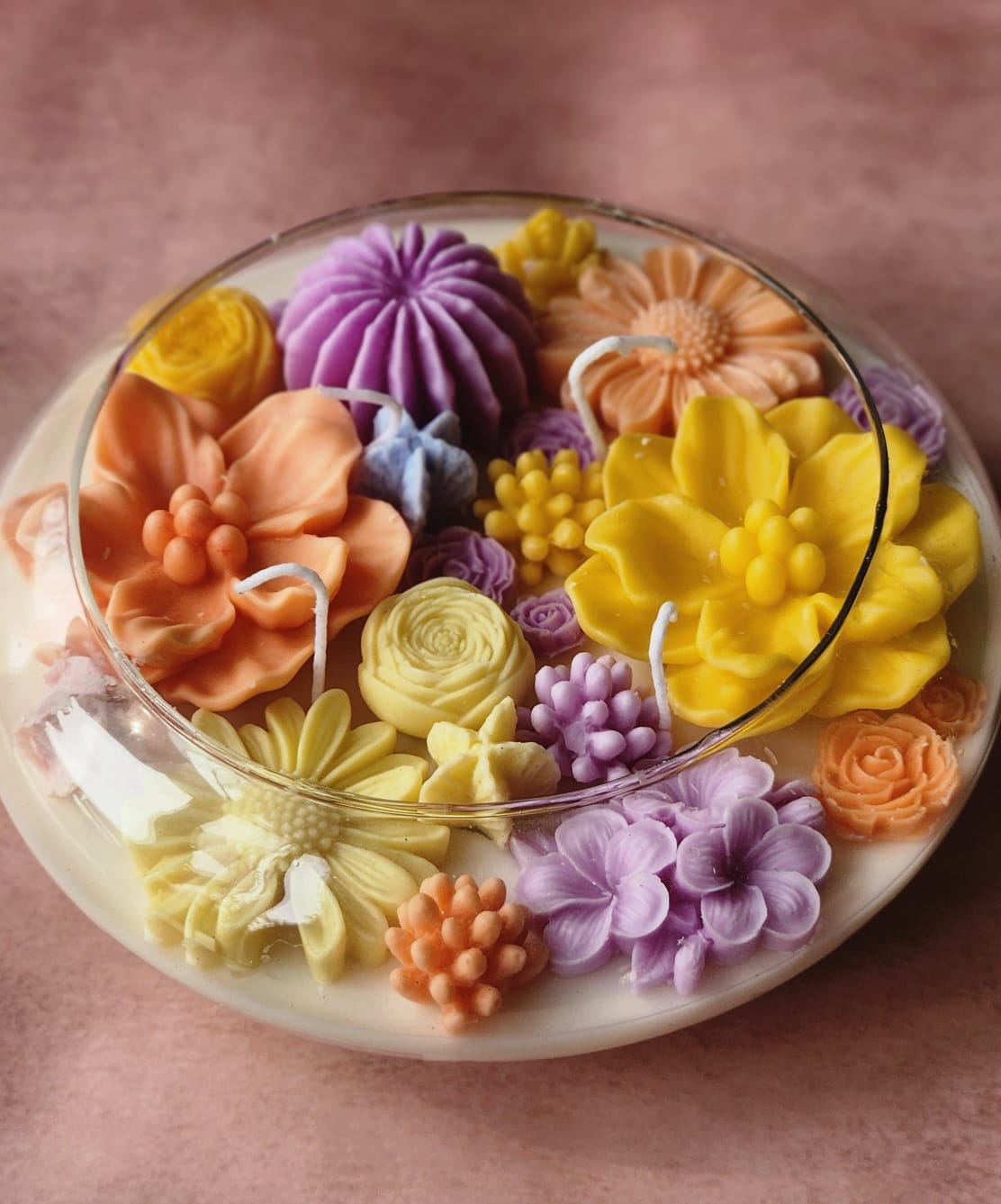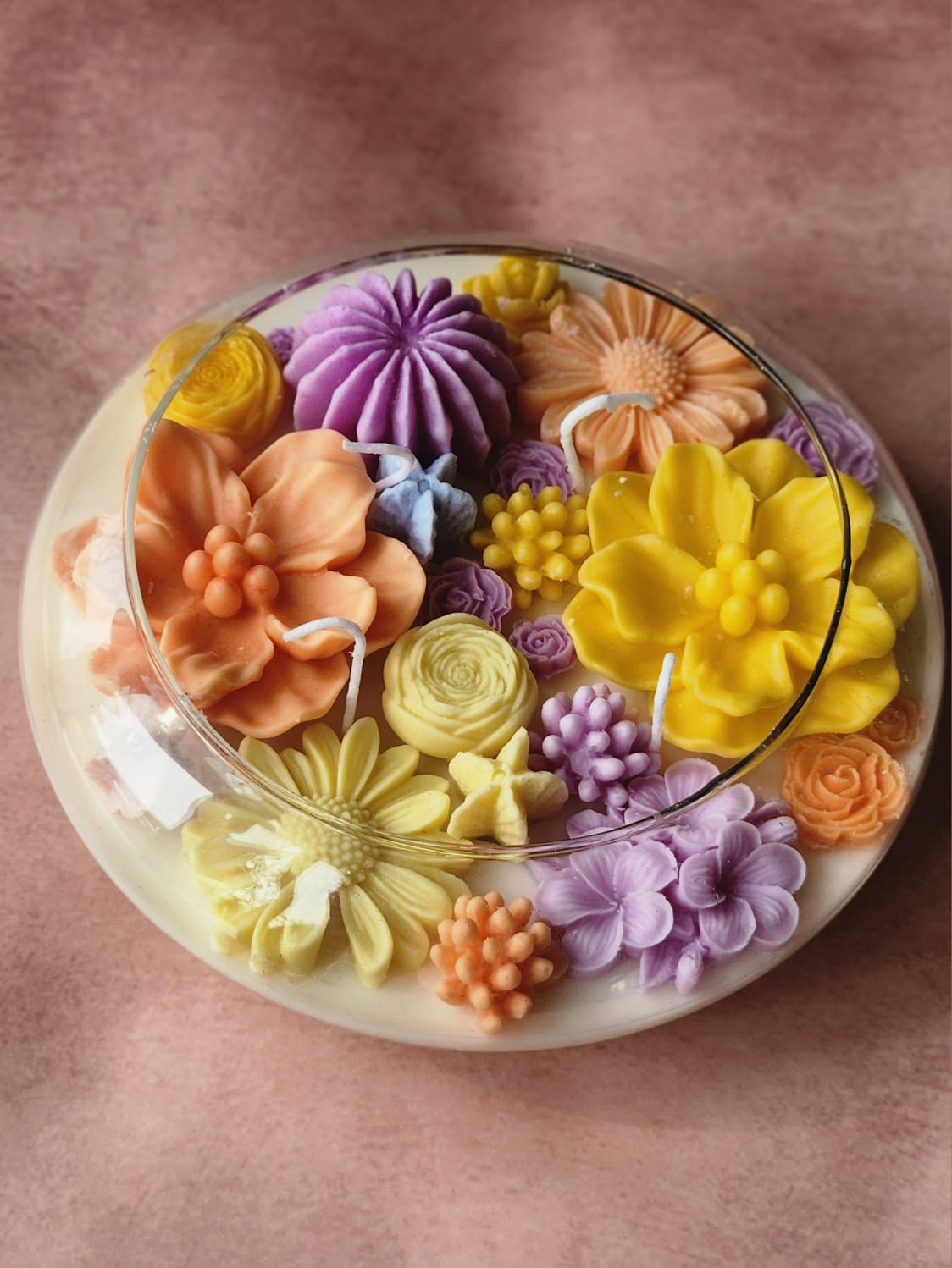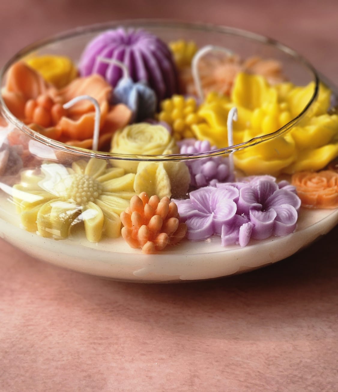 8 inch transparent glass bowl with 5 wick and pure soy wax colourful flowers. It has a divine look and carries an unforgettable fragrance