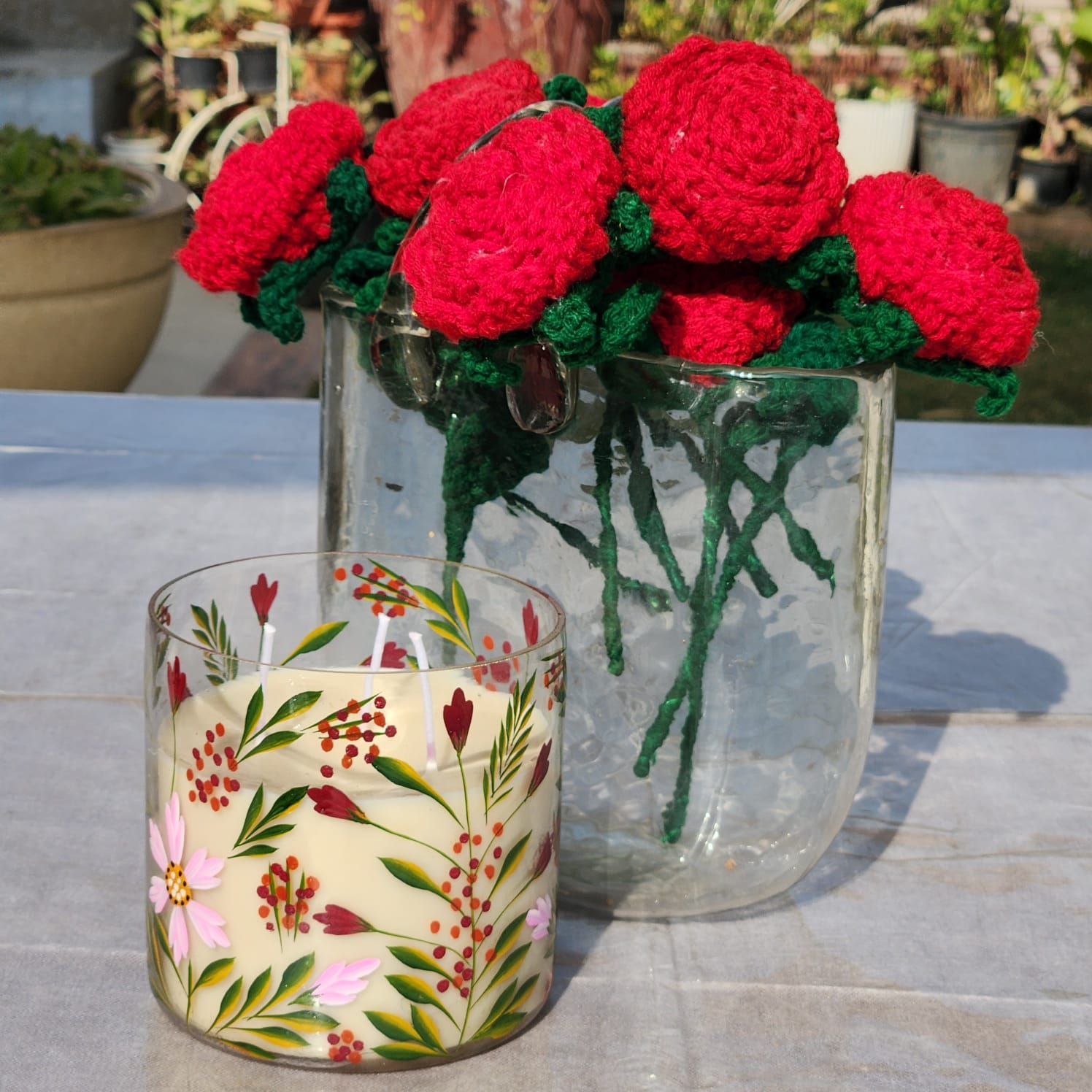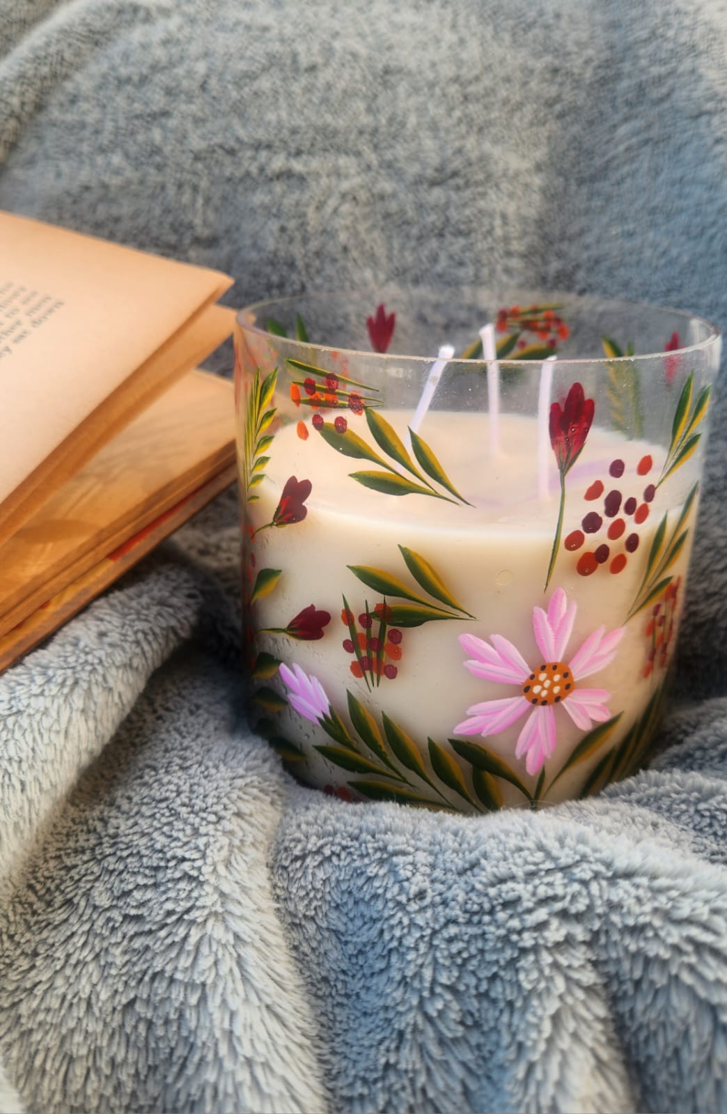 Hand Painted open glass jar with 3 wicks and scented soy wax