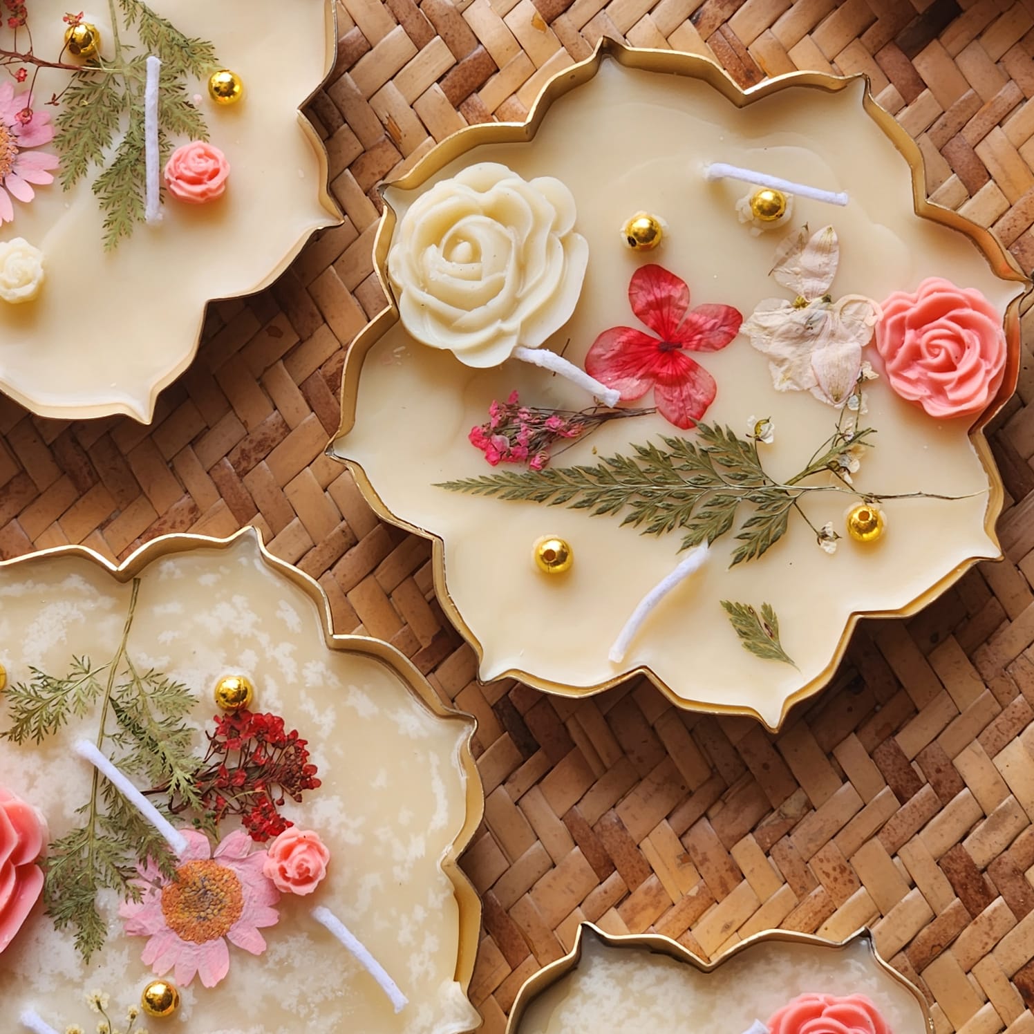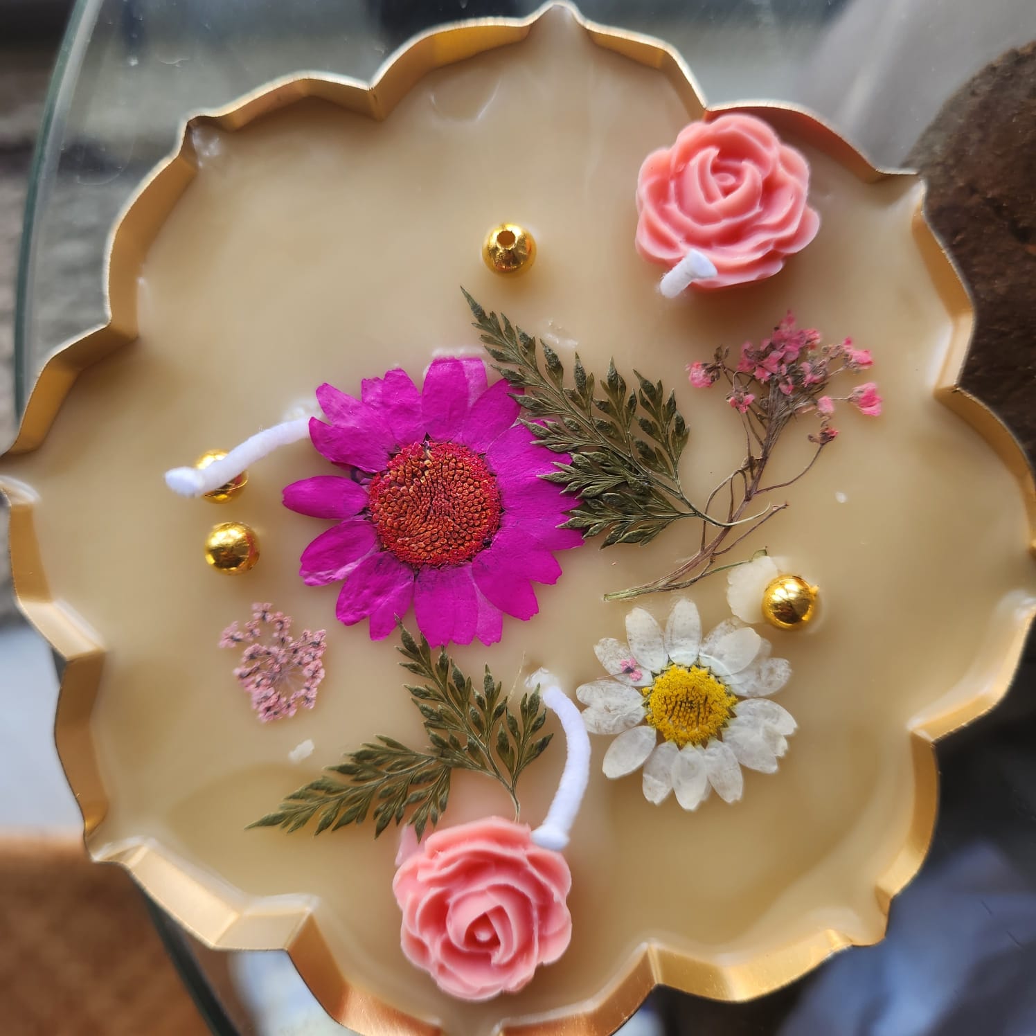 Soft scented soy wax dressed with dry flat flowers and leaves. Golden beads and pearls are added for the glam. Kindly note- every candle will have uniquely placed flower arrangement as we give more emphasis on the aesthetic look