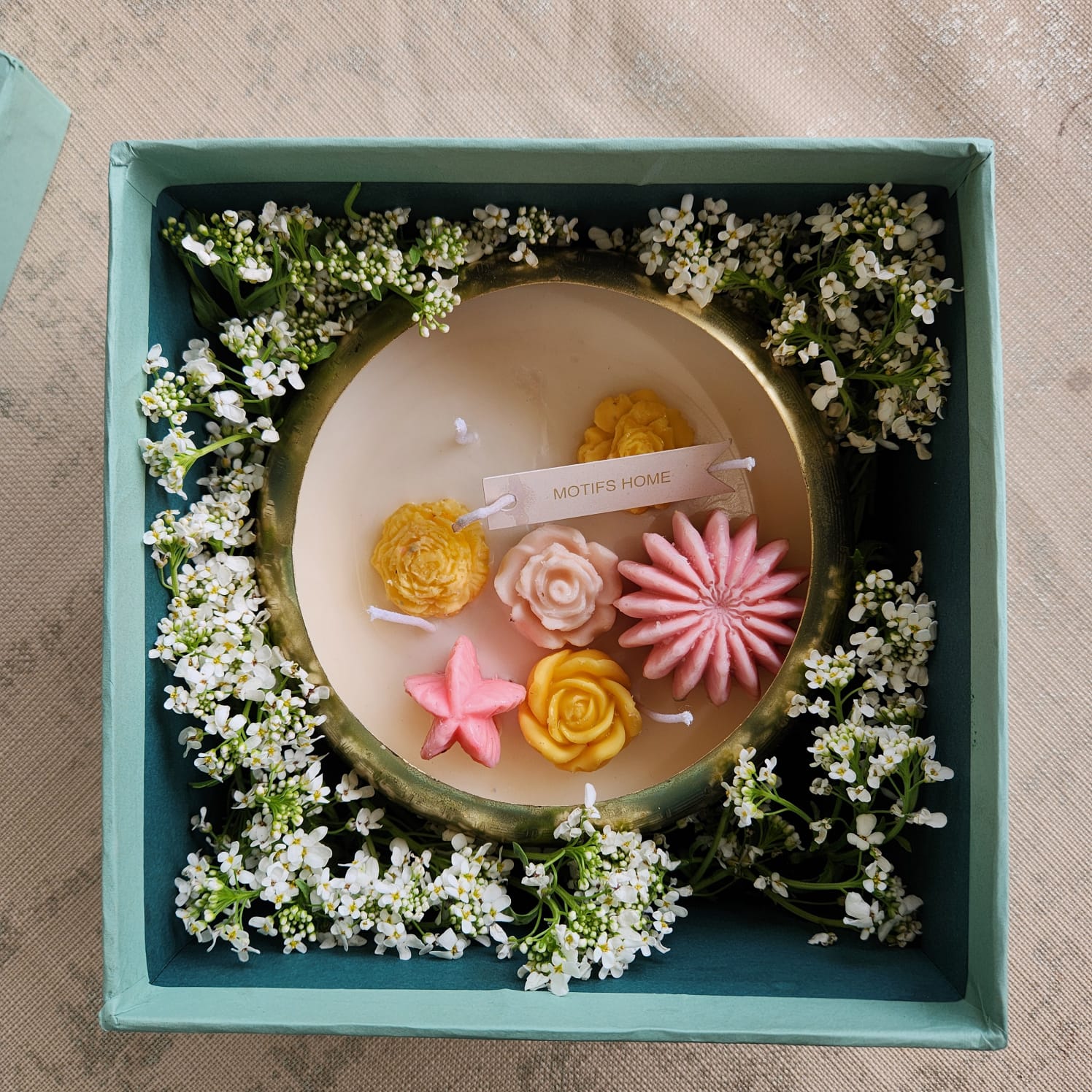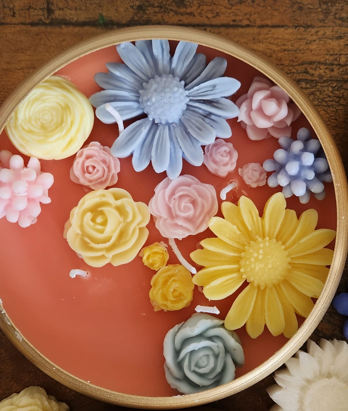 Soft scented soy wax dressed with dry flat flowers and leaves. Golden beads and pearls are added for the glam. Kindly note- every candle will have uniquely placed flower arrangement as we give more emphasis on the aesthetic look